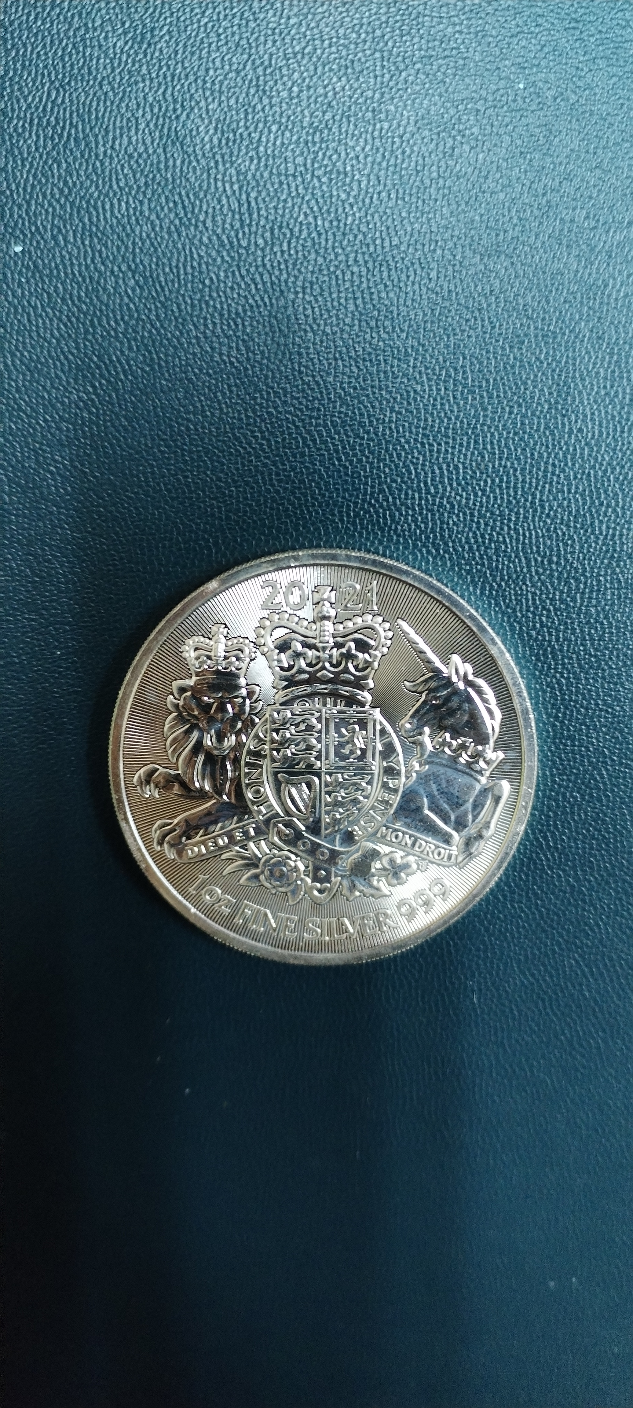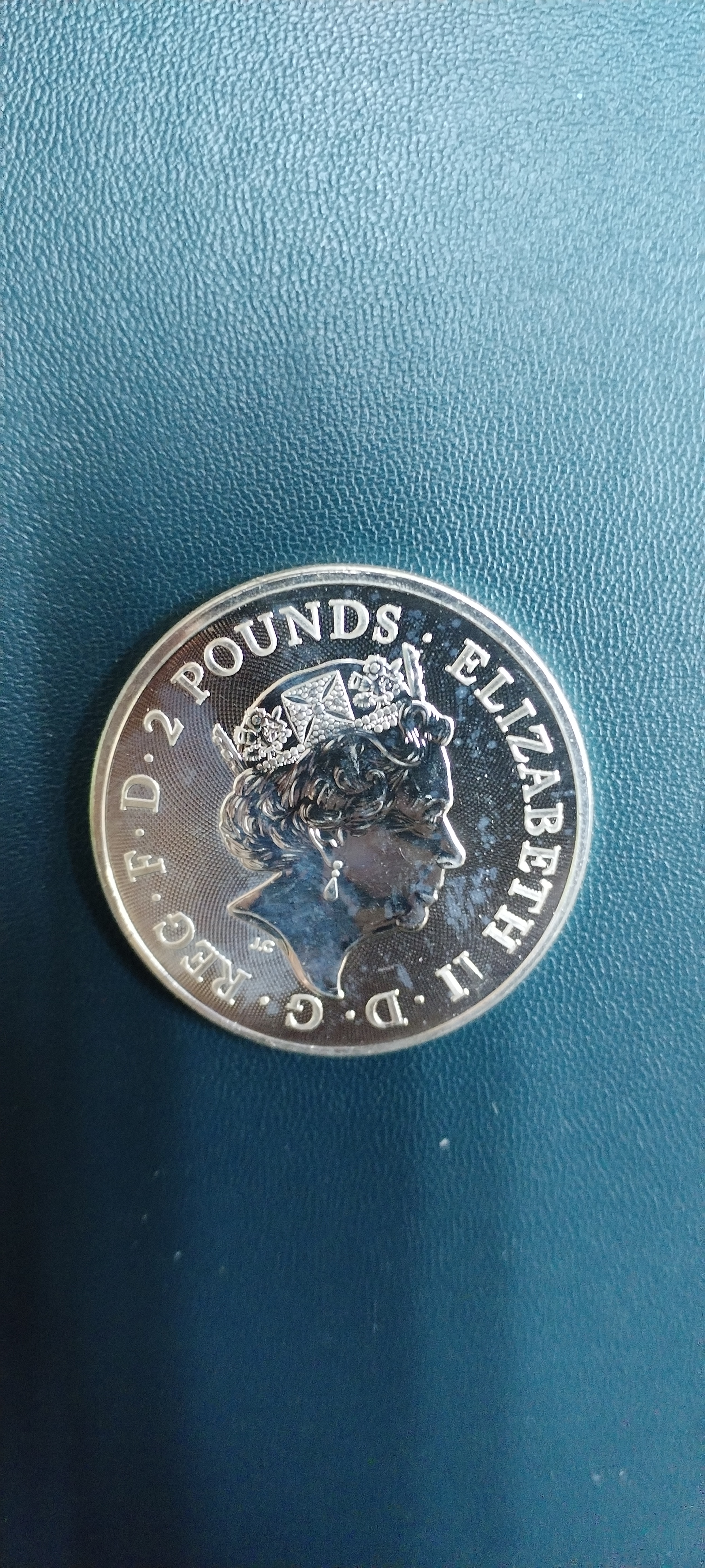這枚 2021 年的英國皇家徽章銀幣,正面刻有約迪·克拉克(Jody Clark)設計的伊麗莎白二世女王陛下肖像,並標示面額「2 POUNDS」。
