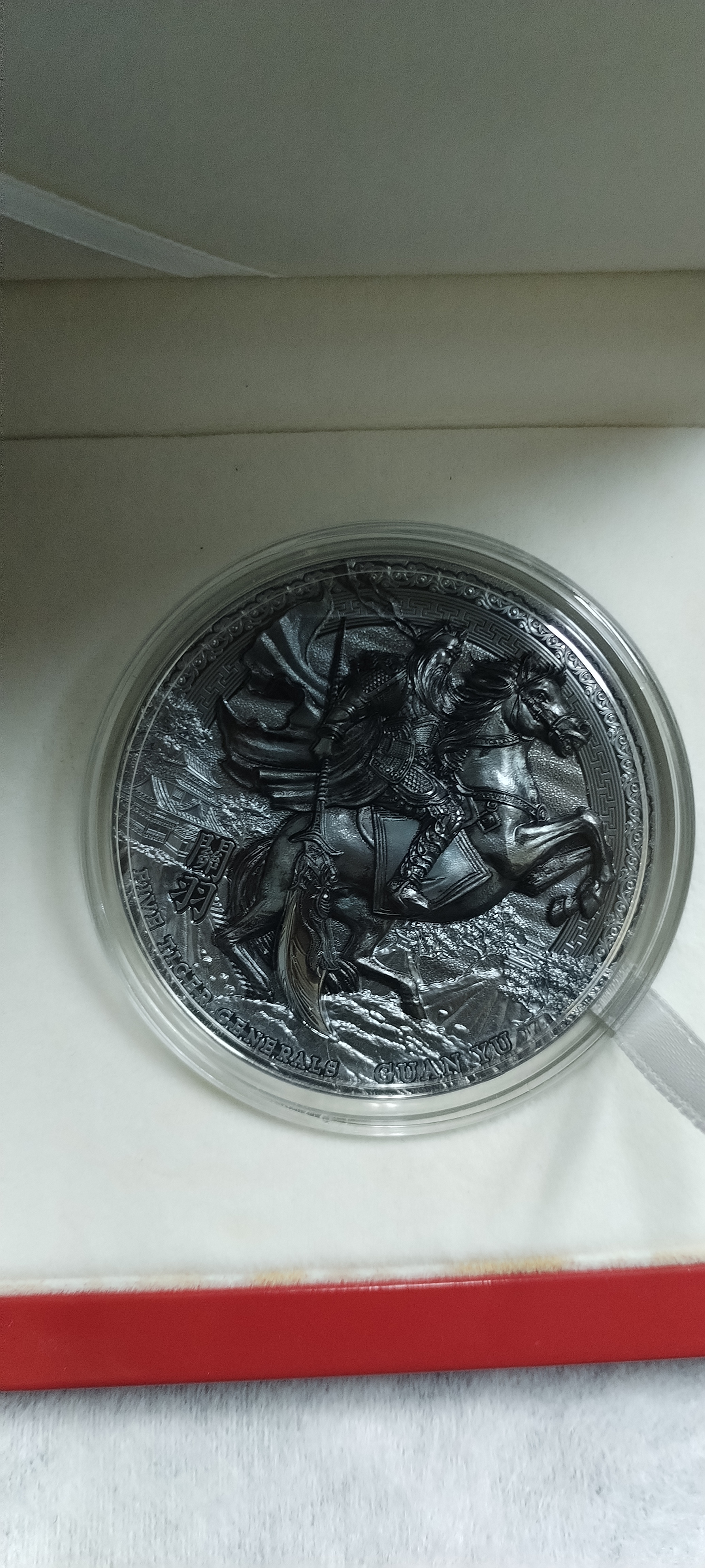 正面:描繪了關羽將軍騎乘戰馬,手持青龍偃月刀的威武姿態。幣面刻有「GUAN YU」和「FIVE TIGER GENERALS」字樣,彰顯其主題。