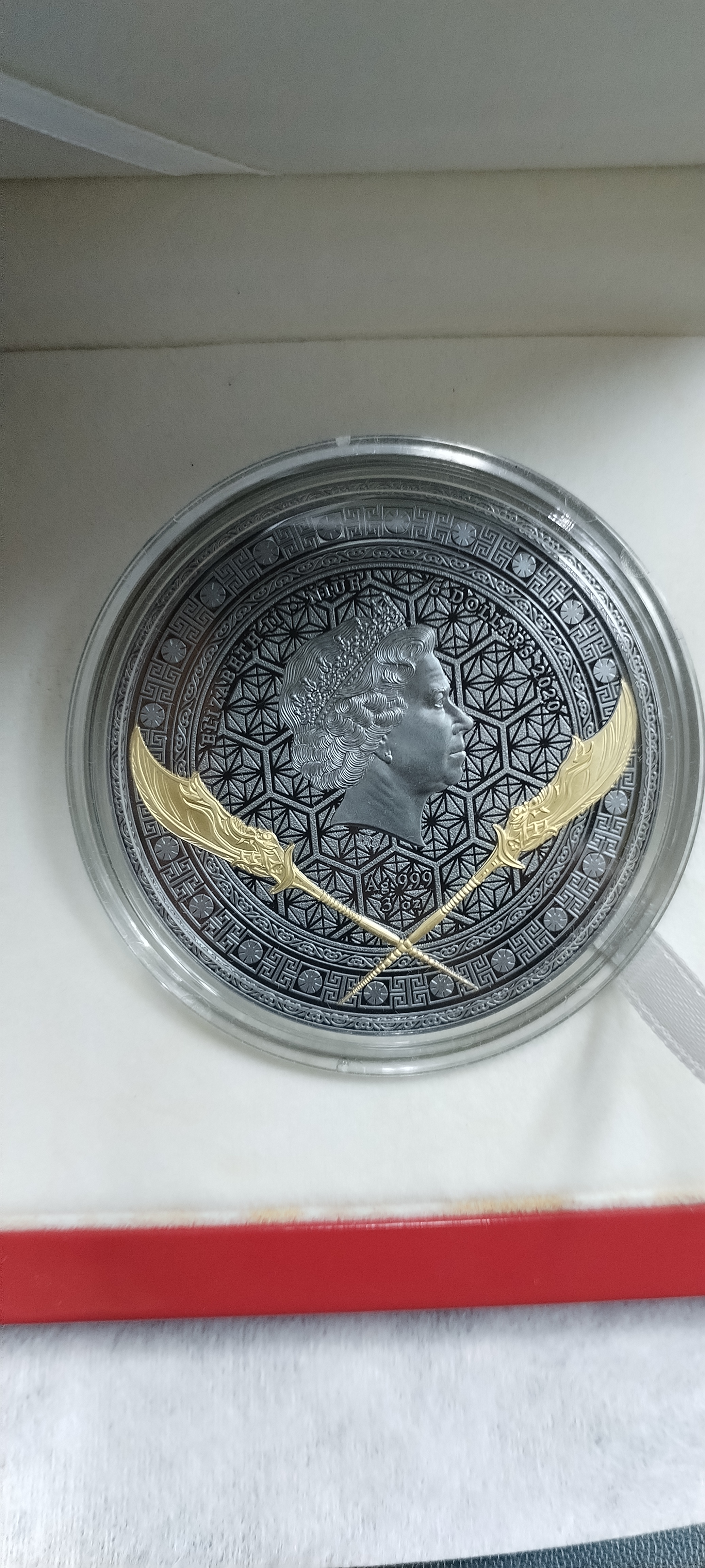反面:展示了伊麗莎白二世女王的肖像,背景是複雜的幾何圖案。肖像下方交叉著兩把鍍金的武器,與關羽的主題相呼應。幣面刻有「ELIZABETH II」、「NIUE ISLAND」、「2020」、「5 DOLLARS」以及「3 OZ 999 FINE SILVER」,明確標示了發行國家、年份、面額、重量和純度。