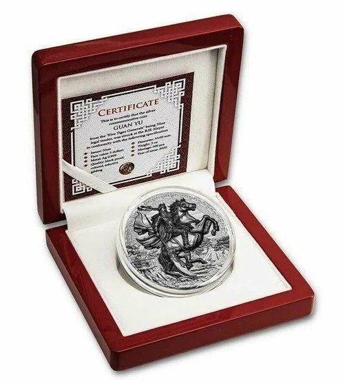 這枚精美的銀幣是2020年發行的「關羽五虎將」系列中的一枚,由紐埃島鑄造。幣面設計精緻,呈現了中國歷史上著名的將軍關羽的英勇形象。