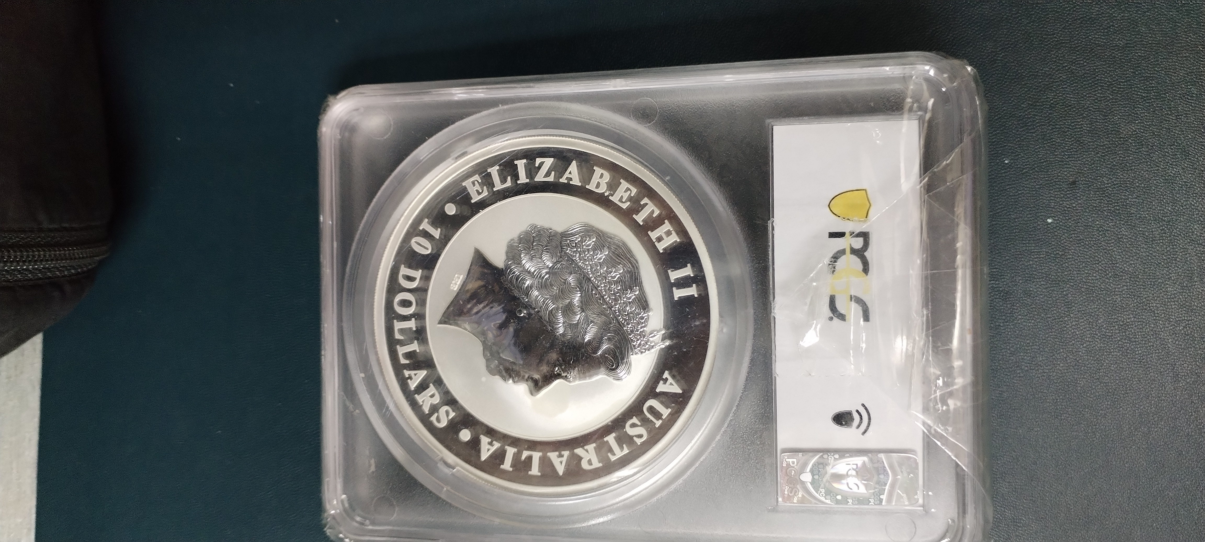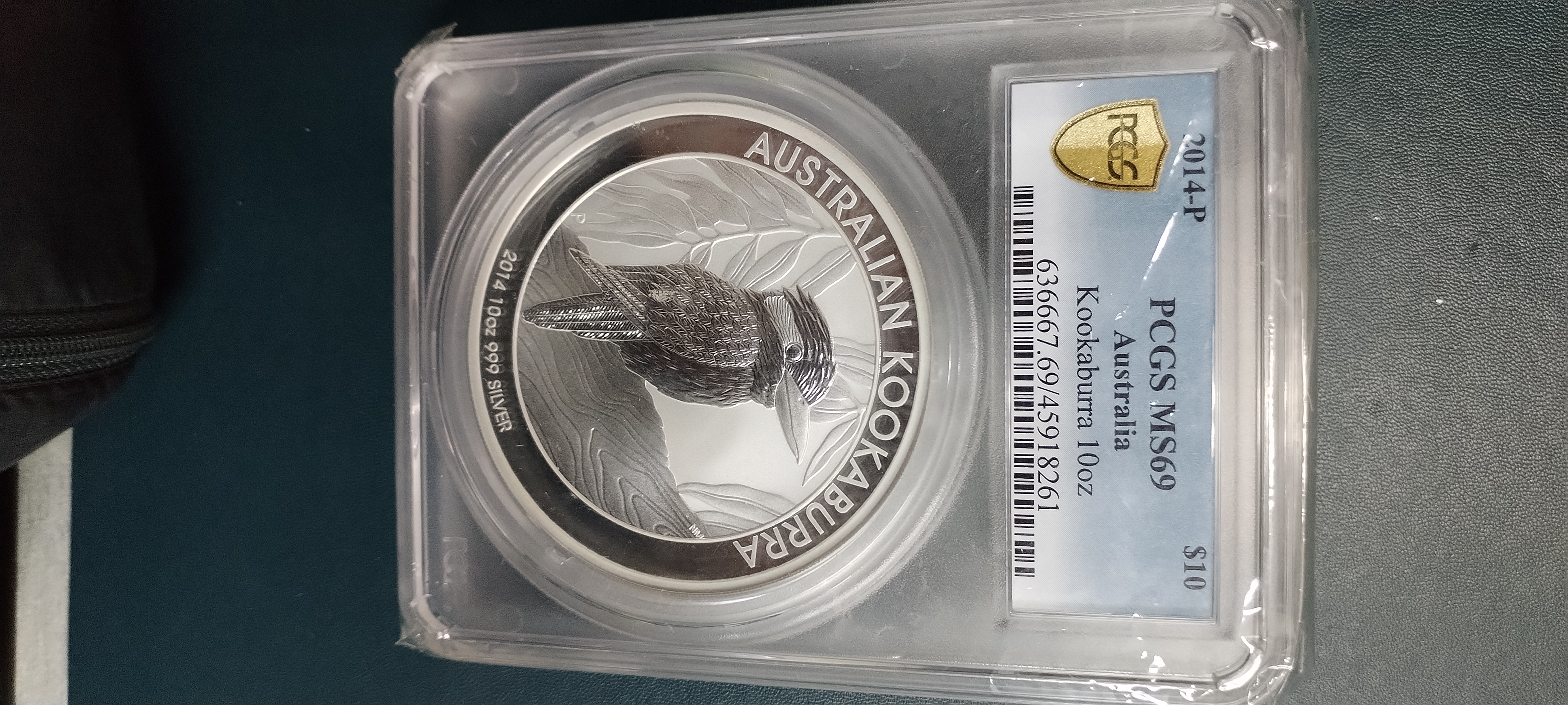 這是一枚2014年澳洲笑翠鳥10盎司999純銀幣,由PCGS評級為MS69。硬幣正面刻有笑翠鳥圖案,並標示年份「2014」、重量「10oz」及純度「999 SILVER」。背面則為伊麗莎白二世女王肖像,並標示面額「10 DOLLARS」及發行國「AUSTRALIA」。