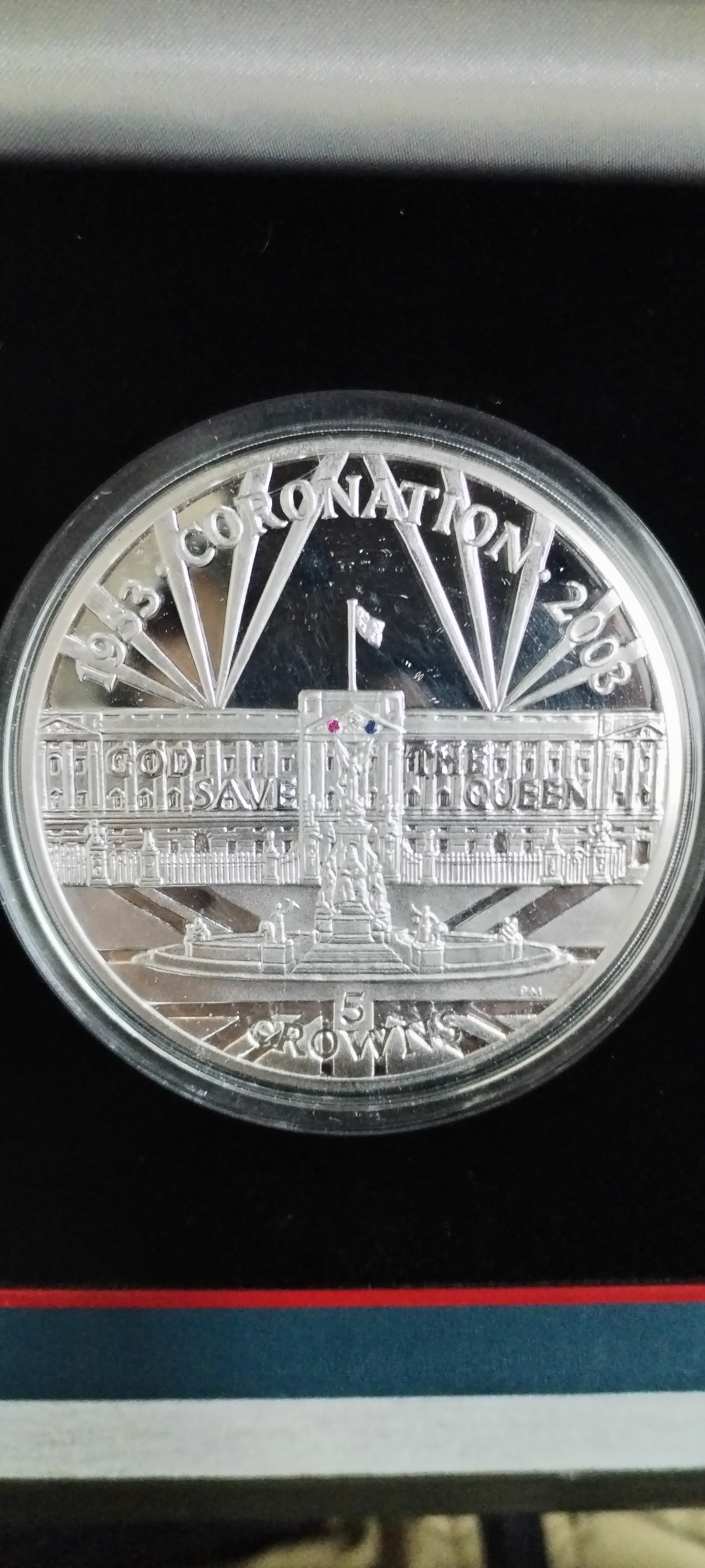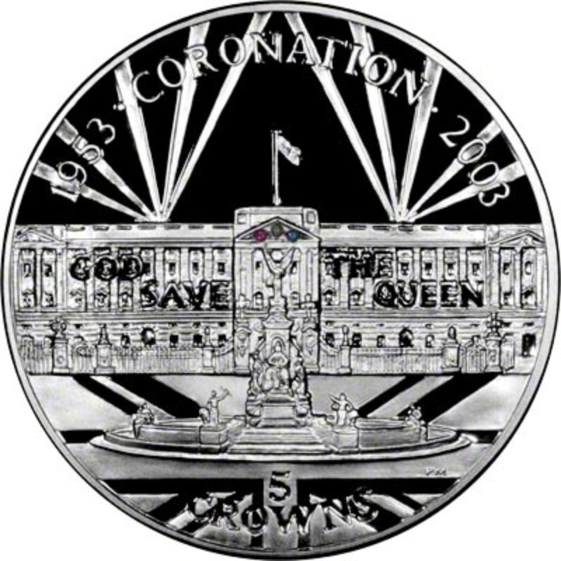 此枚銀幣為紀念英國女王伊麗莎白二世加冕50週年而發行。設計正面描繪了白金漢宮,並以「1953 CORONATION 2003」及「GOD SAVE THE QUEEN」字樣環繞,象徵女王長期穩定的統治。面額為5皇冠,凸顯其紀念幣的地位及英國傳統錢幣的特色,為嚴肅的投資者提供兼具歷史意義與貴金屬價值的選擇。